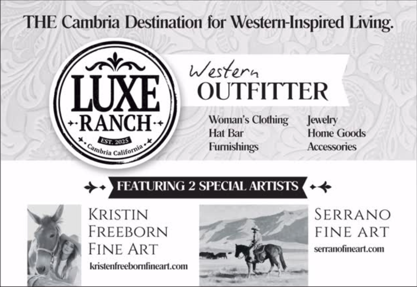 Head to Luxe Ranch—the Cambria destination for western-inspired living—for a special meet-and-greet event with two artists. Kristen Freeborn, an award-winning western artist from Tehachapi, creates oil paintings inspired by her experiences on the horseback trail and visiting the Sierra mountains. Frank Serrano is considered one of today’s top painters of the Western Landscape, whose work can be found in collections, museum exhibitions, and galleries across the country. These two artists will be on-hand at Luxe Ranch to show their works, interact with those who appreciate it, and bring that extra bit of western flair to Cambria.