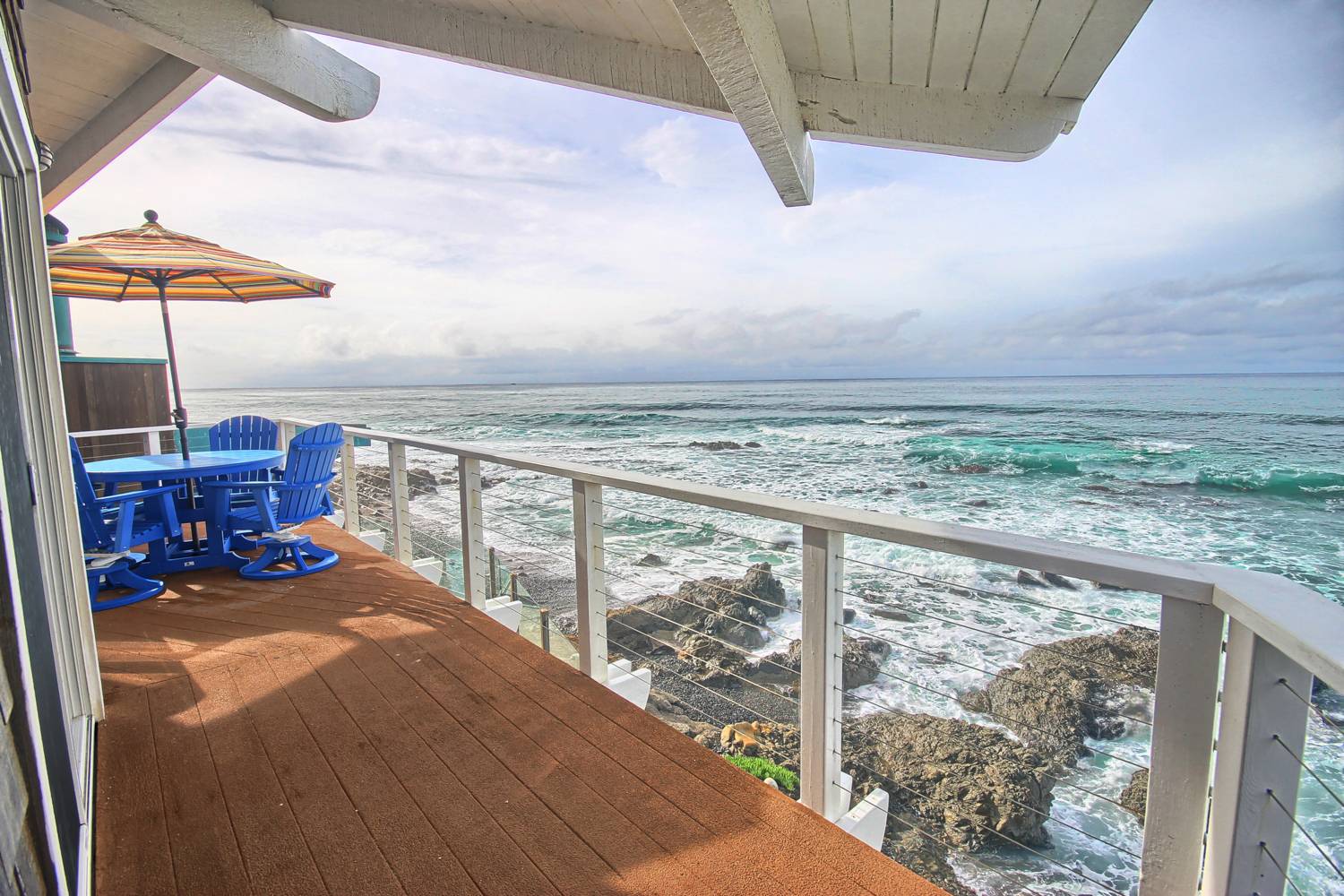 Inn Above Tide is a one-bedroom, two-bath oceanfront home located on Marine Terrace. After playing a few games, relax on one of the two decks and enjoy an amazing sunset overlooking the tide pools and Otter Cove. Once the moon rises enjoy excellent stargazing from the hot tub. High-speed wireless internet is provided so you can check your e-mails while you’re on vacation. Includes a CD player, DVD player, and numerous popular DVDs to choose from for entertainment. There is an electric car charging port in the garage. Bikes available for guests to use as well! There is a bench on the walkway down to the beach, perfect for watching the tide. *THIS HOME REQUIRES A THREE-NIGHT MINIMUM STAY DURING LOW SEASON*