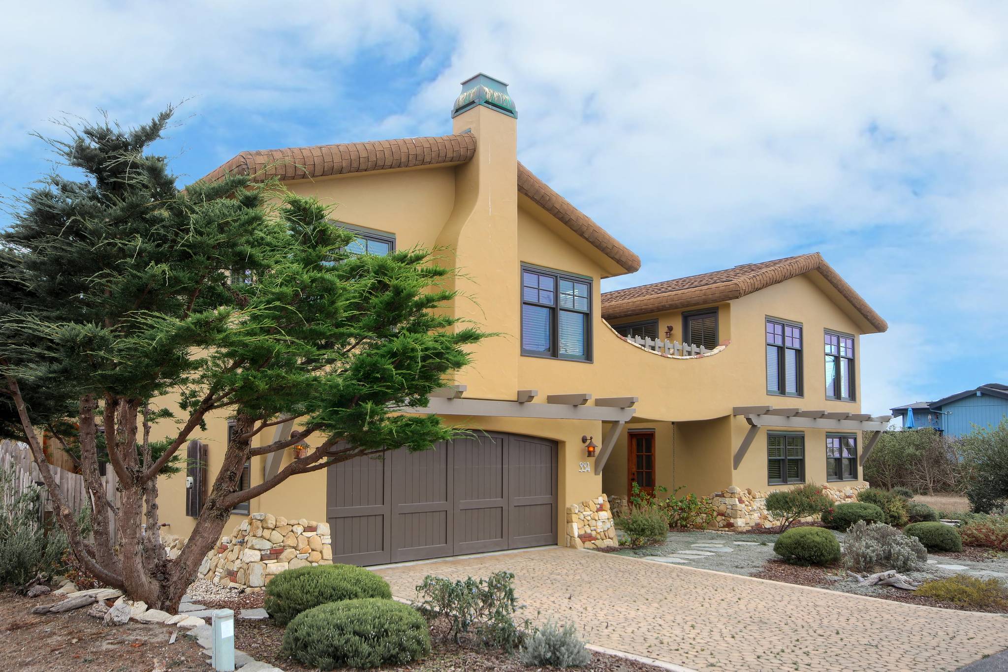 Experience a unique and luxurious vacation home with breathtaking ocean views. The first guest bedroom features two single beds, a flat-screen TV, a gas fireplace, and French doors. The second guest bedroom offers a queen bed and plush carpeting. The entry-level bathroom boasts a marble countertop and dual glass doors. The upper level includes a spacious living/dining area with vaulted ceilings, a gas fireplace, and deck access. The gourmet kitchen is fully equipped with high-end appliances and opens to a large patio. The master bedroom has vaulted ceilings, a gas fireplace, and deck access, with a master bathroom featuring marble counters and a spa shower.